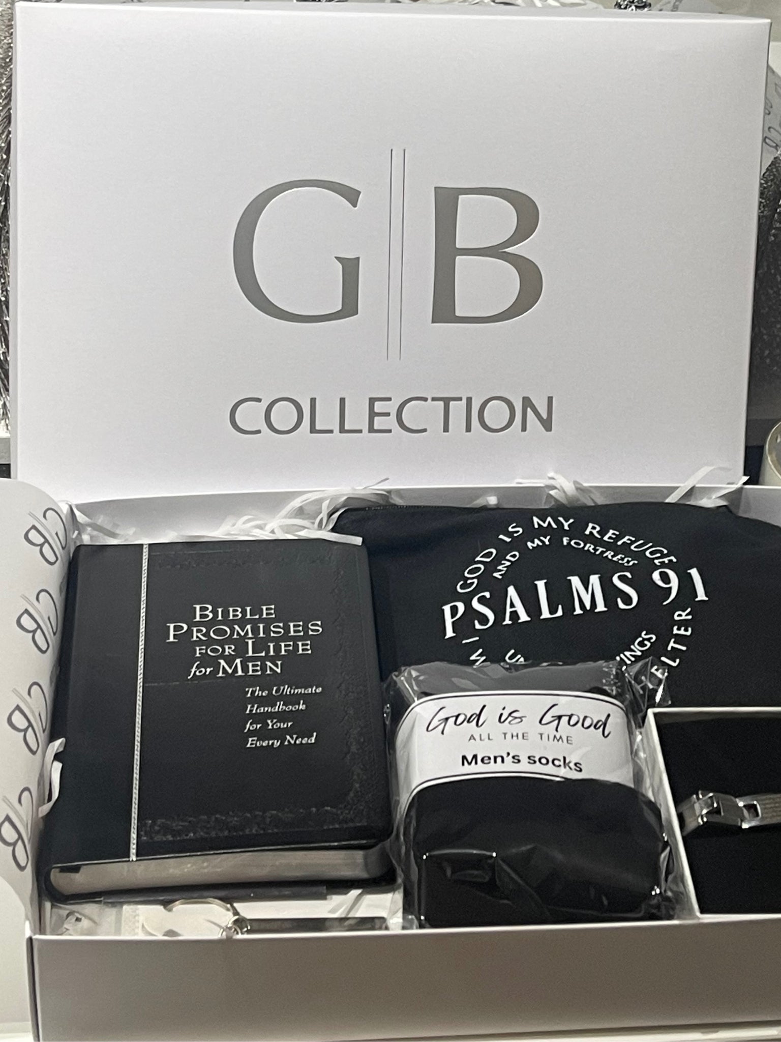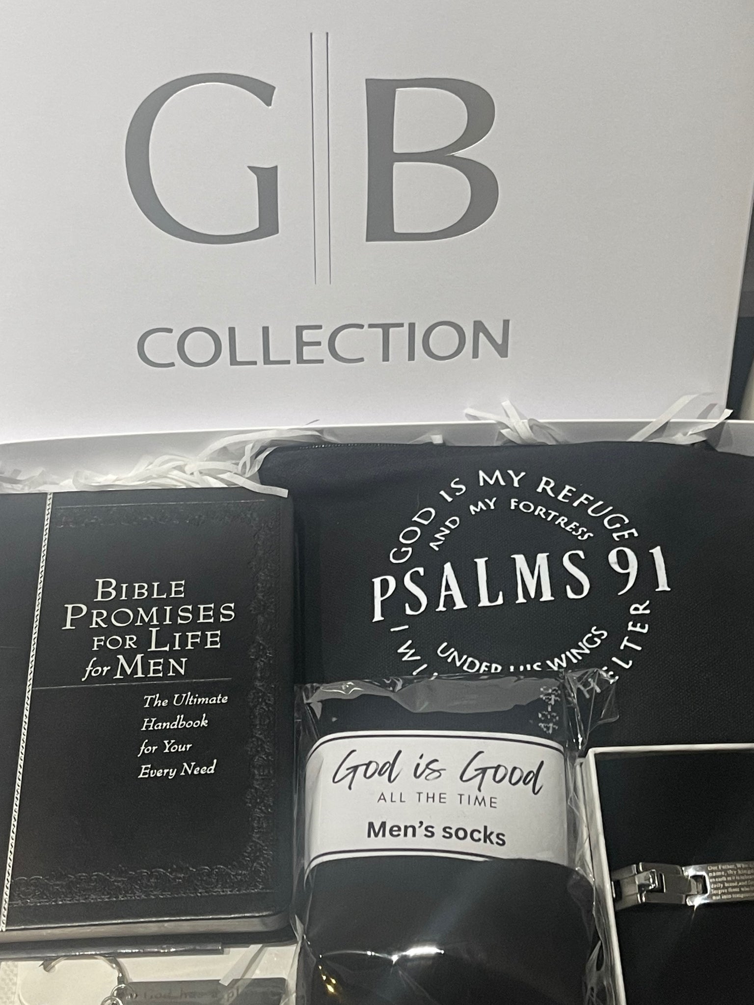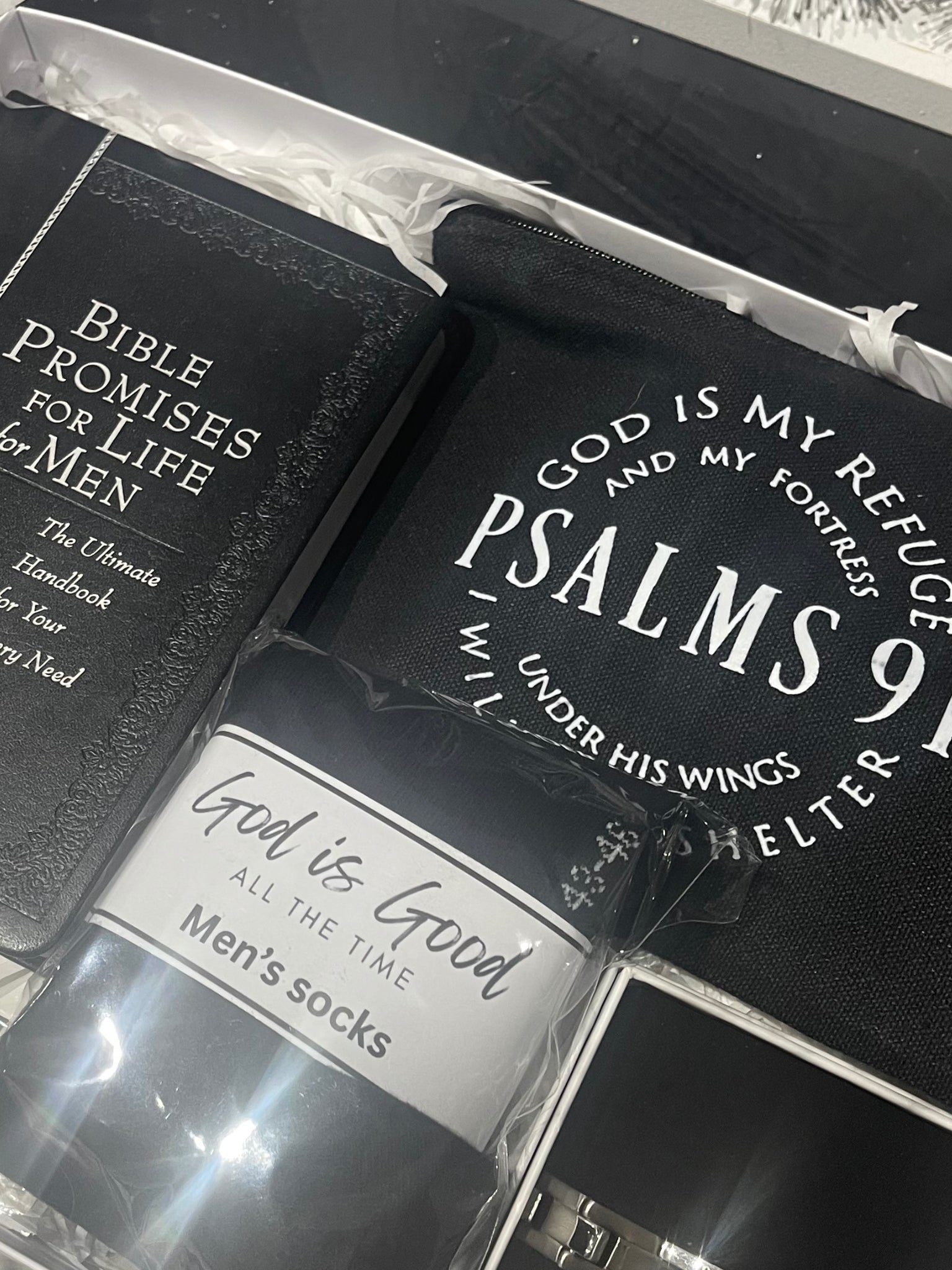 the gift box has a Bible promises book with a pouch to keep it in some socks and bracelet, key ring.Elevate his spiritual journey with the Limited Edition Men’s Bible promises gift box. Featuring a timeless Bible promises book, a pouch for safekeeping, socks, bracelet, and key ring, this elegant set is perfect for any special occasion. Encourage faith, strength, and purposeful living with this thoughtful gift.